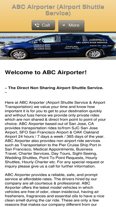 san jose airport shuttle operated by abc airport shuttle in san jose, ca provides a on time reliable ride to san jose airport. san francisco airport & oakland airport. shuttles operate 24 hours a day 7 days a week abc of san jose airport shuttle service also provides car seats for kids upon request. using abc airporter means you're trusted in good hands abc airporter aka san jose airport shuttle is the ground transportation leader in south bay. for any airport transportation needs airport shuttle, airport taxi, airport transfers call us today!