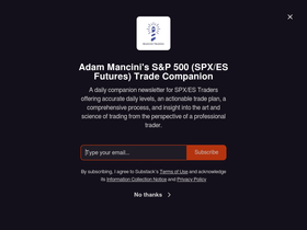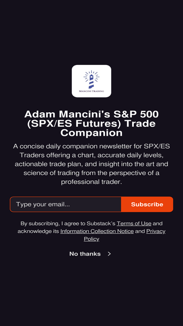 61%A concise daily companion newsletter for SPX/ES Traders offering a chart, accurate daily levels, actionable trade plan, and insight into the art and science of trading from the perspective of a professional trader. Click to read Adam Mancini's S&P 500 (SPX/ES Futures) Trade Companion, a Substack publication.