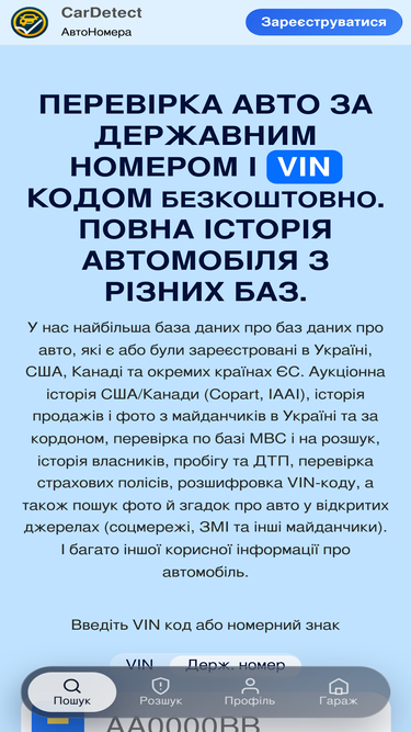 84%пробийте машину по номерах та отримайте інформацію про історію реєстрації, страховку, власників, аукціони та події з автомобілем. пробити номер машини та знайти авто по номеру можна безкоштовно. автономера україна - зручний спосіб перевірити авто за номером. дізнайтеся все про транспортний засіб за допомогою нашого сервісу.