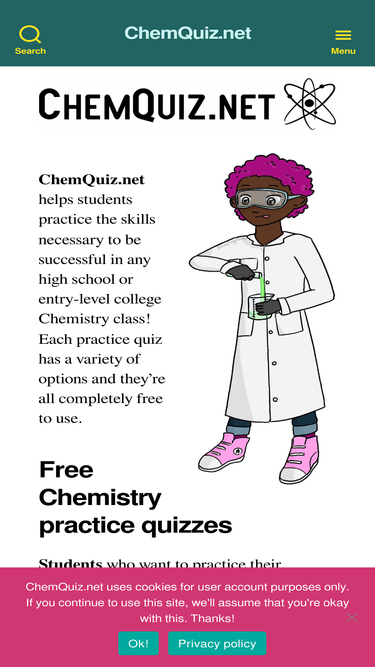 76%Who we are My name is Chris Carman, and I’m a science teacher in Kent, Ohio. I’m the owner of ChemQuiz.net LLC. My website address is: https://chemquiz.net. What personal data we collect and why we collect it Your personal data is your own personal property. For a user account, I only collect email address, first […]