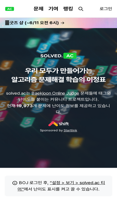 75%알고리즘 문제해결 학습의 이정표 🚩 Baekjoon Online Judge 문제들의 난이도 및 티어 정보를 제공하는 사이트입니다.