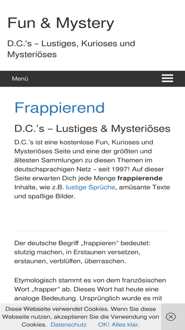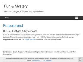 98%d.c.'s - lustiges & mysteriöses d.c.'s ist eine kostenlose fun, kurioses und mysteriöses seite und eine der größten und ältesten sammlungen zu diesen themen im deutschsprachigen netz - seit 1997! auf dieser seite erwarten dich jede menge frappierende inhalte, wie z.b. lustige sprüche, amüsante texte und spaßige bilder. der deutsche begriff „frappieren“ bedeutet: stutzig