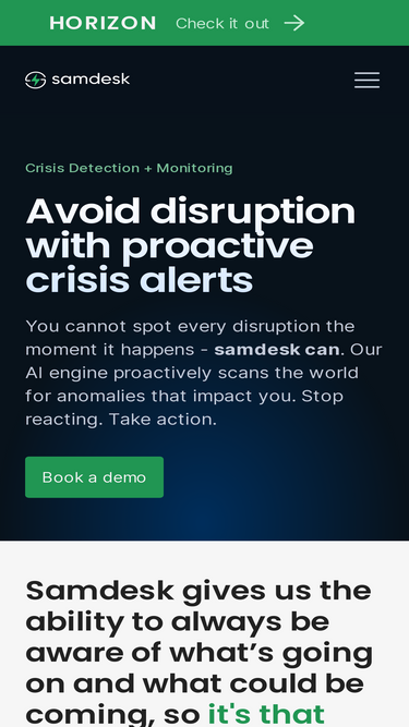 82%Samdesk is a global disruption monitoring tool powered by big data and AI. Get real-time crisis alerts when it matters most.