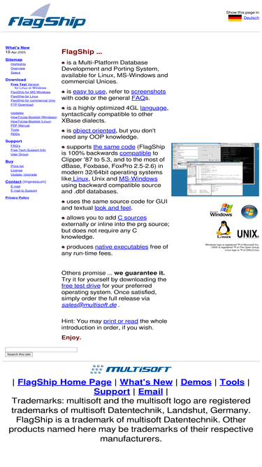 79%home page of the flagship dbms compiler - a database development and porting system for moving xbase based languages to unix or to develop new .dbf based applications quickly.