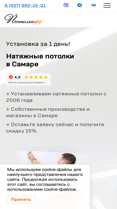 Заказать установку натяжного потолка в Самаре по низкой цене с гарантией✅, ☎ +7(937)982-25-01, скидки до 25%! Конструкции различной сложности, пылесборник, более 15 лет на рынке натяжных потолков Самары.