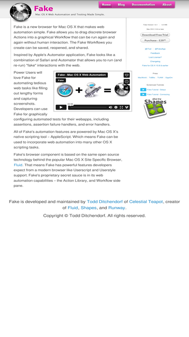 76%fake is a new browser for mac os x that makes web automation simple. fake allows you to drag discreet browser actions into a graphical workflow that can be run again and again without human interaction. and fake workflows can be saved, reopened, and shared.