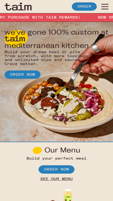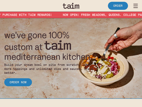 82%taim means tasty, which perfectly describes our made-from-scratch bowls, pitas, and salads. In the taim kitchen, we make everything in-house daily with the freshest produce, herbs and spices. We create delicious balanced dishes you can customize to your liking. Get your custom craving in-store, via pick-up or delivery.