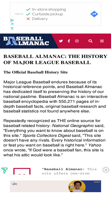 100%Complete source for baseball history including complete major league player, team, and league stats, awards, records, leaders, rookies and scores.