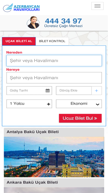 91%Azerbaycan Havayolları (Azerbaijan Airlines) ile Baküʹye uçak bileti satın almak için 444 34 97 yada 0 212 603 53 00 nolu telefon numaralarını arayabilirisiniz.