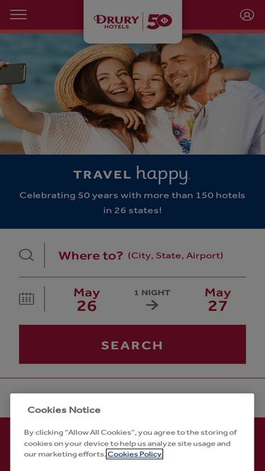 90%travel happy® with drury hotels, with more than 150 hotels in 26 states. breakfast, wi-fi, dinnertime snacks, soft drinks, popcorn, business center, workout facilities and more - we've got you covered!