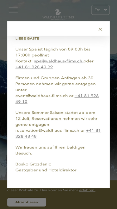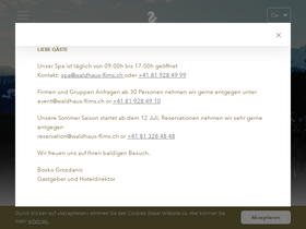 Dear Valued Guests, Waldhaus Flims Wellness Resort is currently closed as we embark on an exciting journey to enhance our facilities. During this time, we will be renovating our infrastructure to ensure an even higher level of comfort and luxury for your future stays. We look forward to welcoming you back for the Winter Season 2026-2027 and will keep you informed of the official reopening date. We can’t wait to host you again in our beautifully refreshed resort, nestled in the breathtaking Swiss Alps! Warm regards, The Waldhaus Flims Team +41 81 928 48 48 info@waldhaus-flims.ch Via dil Parc 3, 7018 Flims, Switzerland