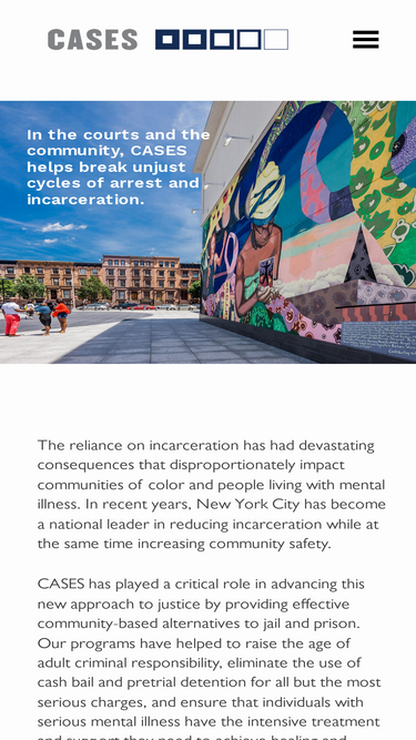 89%CASES does what prisons cannot: we help people heal, grow, & succeed in their communities DONATE Learn about our Work We provide comprehensive and compassionate services, featuring proven alternatives to incarceration and nationally recognized mental health programs. LEARN MORE Join the CASES Team We offer career opportunities for people dedicated to supporting some of our city's