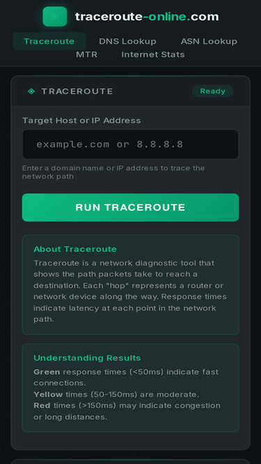 85%online traceroute with visual mapping. gathers detailed asn and location information. map the packets path.