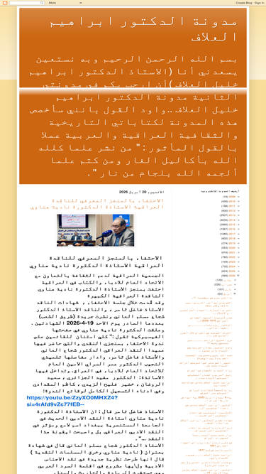 بسم الله الرحمن الرحيم وبه نستعين يسعدني أنا (الاستاذ الدكتور ابراهيم خليل العلاف )أن ارحب بكم في مدونتي الثانية مدونة الدكتور ابراهيم خليل العلاف ..واود القول بانني سأخصص هذه المدونة لكتاباتي التاريخية والثقافية العراقية والعربية عملا بالقول المأثور : " من نشر علما كلله الله بأكاليل الغار ومن كتم علما ألجمه الله بلجام من نار " .
