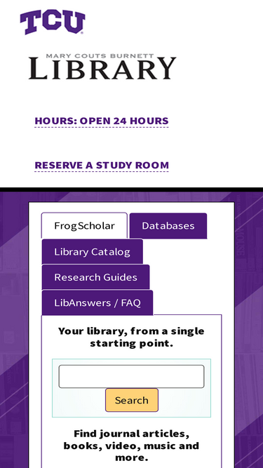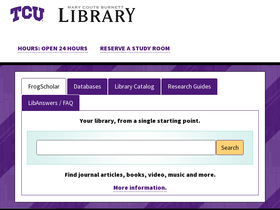 86%library for texas christian university. catalog, databases, electronic and print journals, a/v collections; federal, state and eu documents.