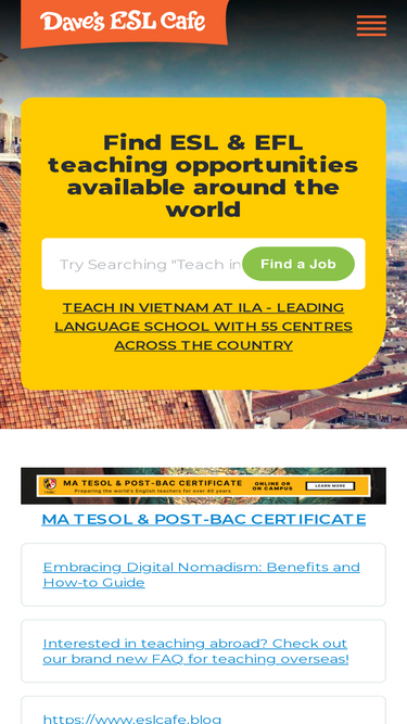 90%welcome to dave’s esl cafe, the leading destination for all things esl. from job opportunities and teaching resources to grammar guides and community forums, we’re here to help you navigate the world of esl. whether you’re a teacher, learner, or employer, explore a universe of possibilities with us.