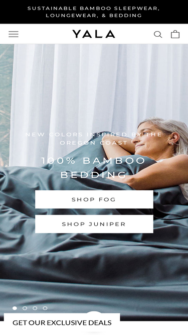 88%YALA produces high-quality, comfortable, clothing, sleepwear, loungewear and bedding from sustainably-sourced, natural material: bamboo viscose, organic cotton, baby alpaca, silk, and fleece. Your comfort is our first priority, so we make apparel you'll look good in and WANT to wear all day, everyday.