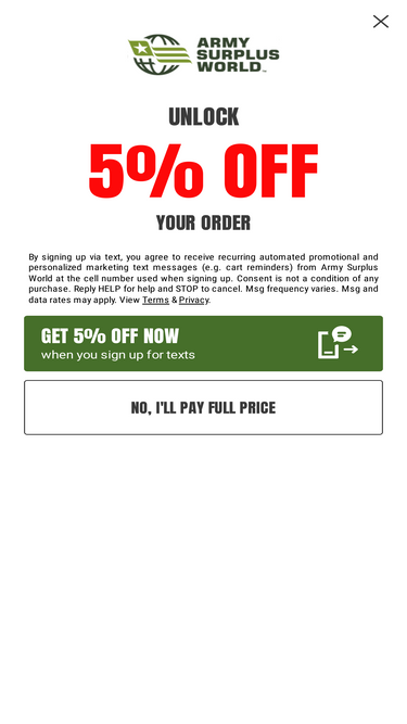 89%Read the Army Surplus World privacy policy to learn about the collection, use and disclosure of the personal information from our website users.