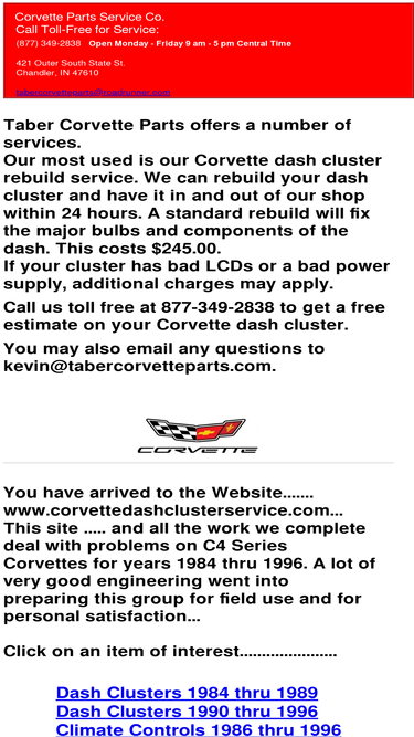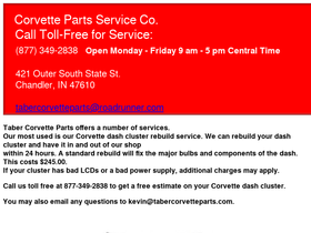 87%corvette electronics service for dash clusters at $245.00. new power supplies and new lcd's at additional cost. call for the best cluster repair price 86 thru 89 climate control,call toll free 1 877 349 2838.