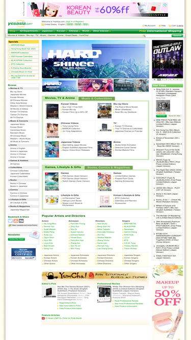 welcome to yesasia.com. we are the number one online shopping website for asian entertainment products covering asian movies and videos, japanese, korean, and chinese movies, tv dramas, asian music, books, comics, games, electronics, and more! we offer free international shipping. - north america site