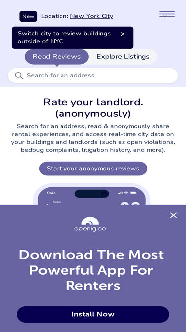 62%Search 1 million+ addresses, read landlord reviews, access city-data, and find highly-rated apartments. openigloo helps renters avoid bedbugs and neglectful landlords. Don't sign a lease without vetting your building on openigloo.