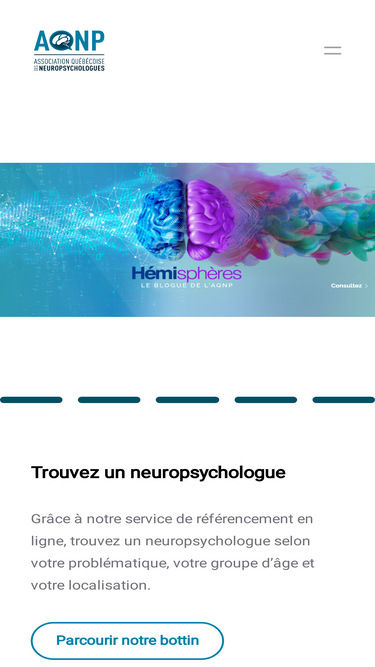 96%Fonctionnement du service de référence Ce service de référence vous permet d’effectuer une recherche par problématique, groupe d’âge et type d’intervention en fonction de votre localisation pour obtenir une liste de neuropsychologues membres de l’AQNP qui offrent leurs services en pratique privée. Vous pouvez également effectuer une...