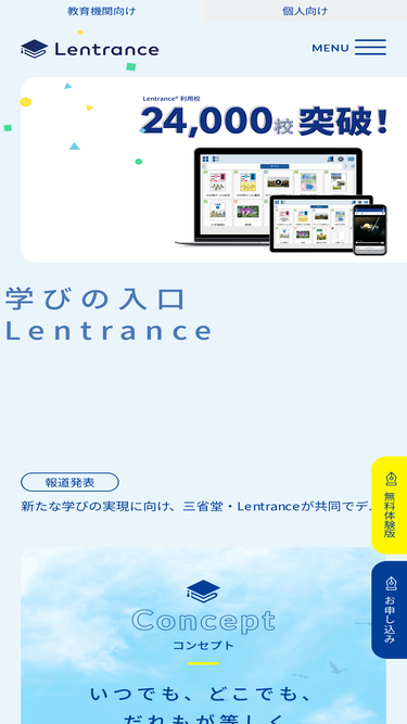 75%Lentrance®(レントランス)は、いつでも、どこでも、学びにアクセスできるICTプラットフォームです。デジタル教科書をはじめとする学校用教材の利用や通信教育・塾などの教育サービス、自宅学習など、一人ひとりの多様な学びをICTの力でサポートします。