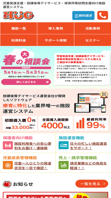 85%児童発達支援・放課後等デイサービス・保育所等訪問支援の運営と療育を支援する成長療育型施設運営ソフトウェア「hug(ハグ)」は児童の育みを支援し、施設のスタッフ様と保護者様とをつなぎ事業者様の発展に貢献するシステムです。オンライン支援・在宅支援対応