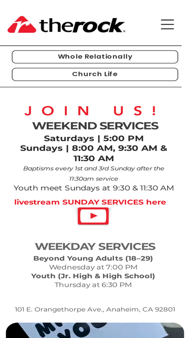 100%Join us at The Rock in Anaheim this weekend! Discover community & faith. Watch services online or visit today!