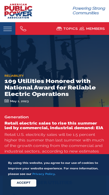 79%the american public power association is the voice of not-for-profit, community-owned utilities that power 2,000 towns and cities nationwide. we represent public power before the federal government to protect the interests of the more than 49 million people that public power utilities serve, and the 93,000 people they employ. the association advocates and advises on electricity policy, technology, trends, training, and operations. our members strengthen their communities by providing superior service, engaging citizens, and instilling pride in community-owned power.