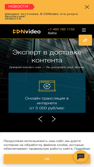84%Контакты CDNvideo. Ведущий провайдер CDN или сети доставки контента. Наши решения: онлайн-трансляции в интернете, защита сайтов от DDoS-атак, ускорение загрузки контента для интернет-магазинов и онлайн игр, HTML5 видеоплеер онлайн, облачные сервера, облачные хранилища S3, облачная видеоплатформа, стабильная работа веб-ресурса при высоких нагрузках. Звоните +7 495 782 17 32!