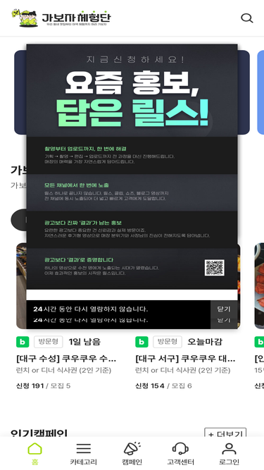 71%블로그, 인스타그램, 유튜브 체험단을 한곳에서! 체험단, 인플루언서는 다양한 체험과 혜택을, 브랜드는 검증된 마케팅 채널을 경험하세요.