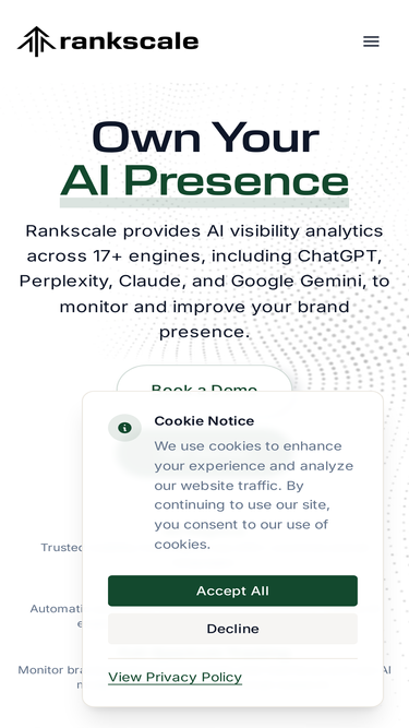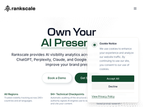 93%Rankscale helps brands take control of how they show up in AI-generated answers. Track your presence, uncover insights, benchmark competitors, and stay ahead.