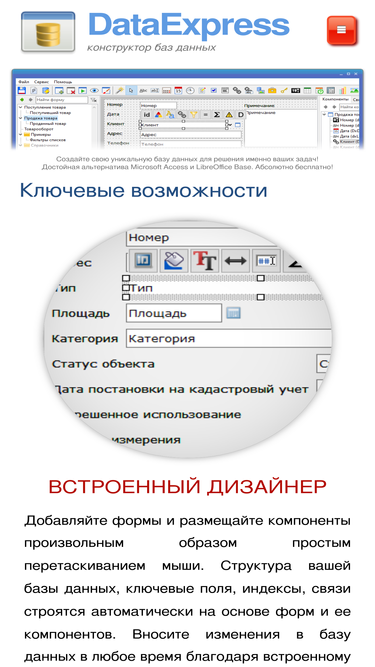 88%конструктор баз данных dataexpress. альтернатива microsoft access, libreoffice base. бесплатная универсальная система учета. разработка баз данных без программирования, генератор печатных форм и отчетов.