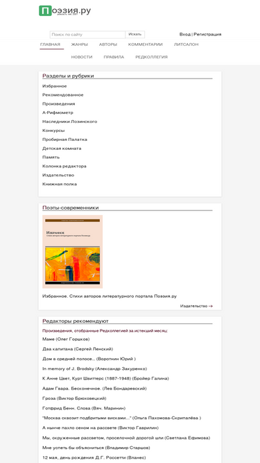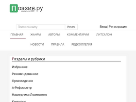 98%российский литературный портал, основанный в 2001 году. является интерактивной площадкой для поэтической коммуникации авторов, пишущих на русском языке, независимо от национальности и страны проживания. предназначен для публикации литературных (преимущественно стихотворных) произведений их авторами и публикации произведений русского поэтического перевода авторами-переводчиками.