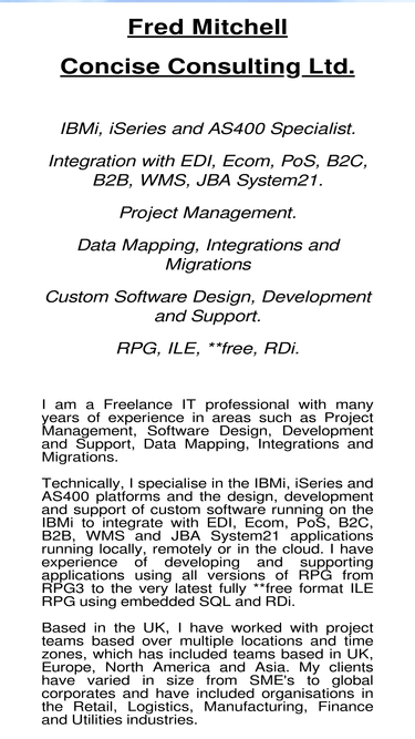 100%Fred Mitchell. Freelance IT Consultant, Project Manager, Business Analyst and Developer. IBM i iSeries AS400 RPG EDI JBA