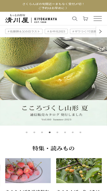 100%庄内米、いも煮、ラフランスなど旬の青果のお取り寄せギフト、ほわいとぱりろーる等山形人気お土産スイーツ、清川屋ならではの山形情報も