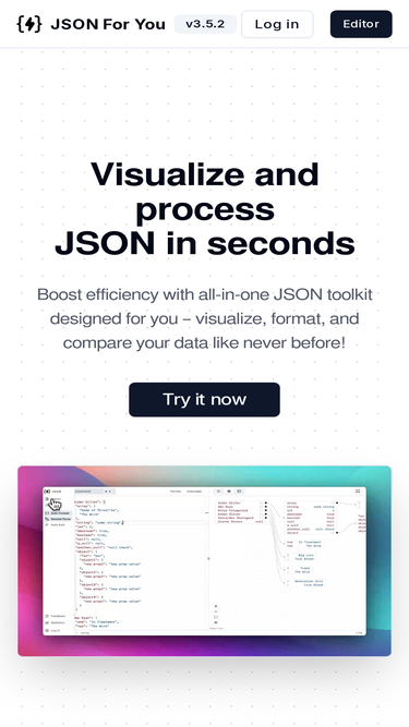76%Online JSON view, format, minify, validate and compare. It also provides graph view to preview JSON data, semantic comparing two JSON diffs, convert JSON to CSV or CSV to JSON and support jq online.