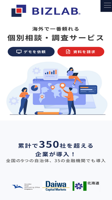 76%海外でビジネスを拡大したい日本企業向けの月額定額制の個別相談・調査サービス。現在40の金融機関を含む500社以上で導入。海外14の国と地域に対応。