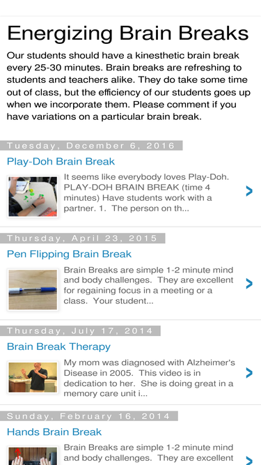 100%Our students should have a kinesthetic brain break every 25-30 minutes. Brain breaks are refreshing to students and teachers alike. They do take some time out of class, but the efficiency of our students goes up when we incorporate them. Please comment if you have variations on a particular brain break.