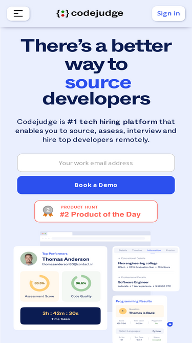 62%Codejudge is an online skill assessment and hiring platform that enables high-growth companies assess and secure top talent faster with zero efforts wastage.