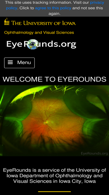 63%eyerounds is a service to the profession by the department of ophthalmology at the university of iowa. case reports, tutorials, ophthalmology images and videos.