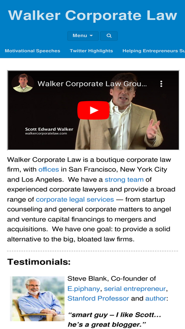 100%walker corporate law is a boutique corporate law firm specializing in the representation of entrepreneurs and startups.