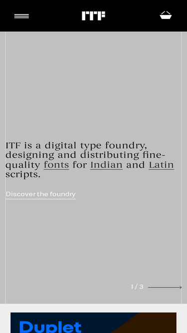 94%ITF’s retail library includes fonts for both text and display use, with styles ranging from traditional to experimental. In addition to its retail offerings, ITF creates custom fonts for leading global brands, designed to meet the specific needs of large organizations. With over 300 retail font families spanning 20 writing systems, ITF is one of the largest independent type foundries in the world.ITF’s flagship Kohinoor Multiscript font family has been part of the permanent “Designer Maker User” exhibition at London’s Design Museum since 2016, which showcases over 1,000 iconic designs from the 20th and 21st centuries. ITF’s fonts have also earned prestigious accolades, including iF Design Awards for custom fonts created for Samsung and Standard Chartered.In addition to its premium offerings, ITF is behind some of the world’s most recognized and widely used free fonts, including Poppins, which is featured on millions of websites globally, as well as Satoshi, Clash Display, Hind, General Sans, and Khand. ITF’s premium fonts are currently used by some of the world’s most iconic brands, including Apple, Google, Samsung, Sony, Amazon, Hyundai, Siemens, Standard Chartered, Pernod Ricard, Dupont, Philip Morris, and Publicis Groupe.At ITF, we remain dedicated to pushing the boundaries of type design, creating fonts that not only meet practical needs but also reflect the cultural and aesthetic diversity of languages and writing systems.