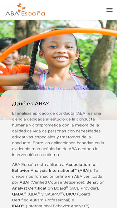 92%El análisis aplicado de conducta (ABA, por sus siglas en inglés) es una disciplina científica bien desarrollada entre las profesiones dirigidas a asistir a personas con necesidades especiales y que se centra en el análisis, diseño, aplicación y evaluación de modificaciones del entorno del cliente, incluido su ámbito social, a fin de producir