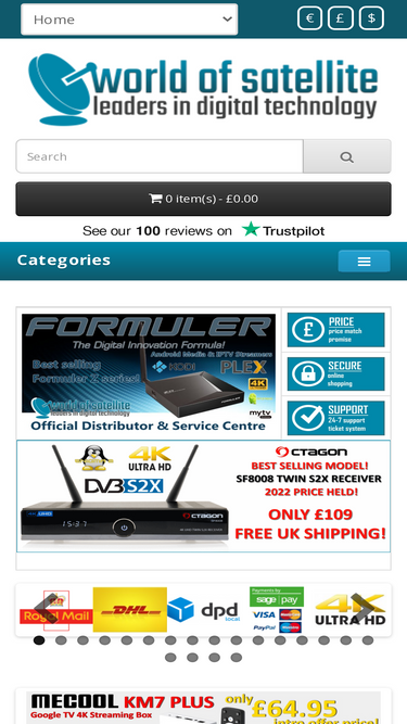 73%sdf trading ltd trading as world-of-satellite are retailers and distributors of many brands, air digital, formuler, gigablue, infomir mag boxes, octagon, technomate, vu+, zgemma and more. we stock android media streamers, iptv set top boxes. linux enigma 2 digital receivers & pvr's. we are official sponsors of the openvix linux enigma 2 team. we are official uk formuler distributors. we offer a 24 hour support ticket system, secure online ordering - paypal and all major cards accepted - order online 7 days a week!