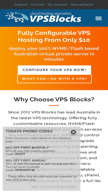 VPSBlocks Hosting Australia offers fully self-healing redundant VPSs, 100% SSD storage (100x faster), 99.99% uptime, Australian support, 15 day money back guarantee, CentOS, cPanel, Windows, openSUSE, CloudLinux, Debian, Ubuntu, Plesk.