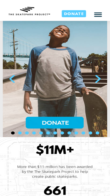 100%Previous Next $13M Nearly $13 million has been awarded by The Skatepark Project to help create public skateparks. 661 661 skatepark projects in all 50 states have received funding from The Skatepark Project. 17M+ More than 17 million visitors annually enjoy skateparks that The Skatepark Project helped fund. 1000+ Thousands of skatepark advocates worldwide have