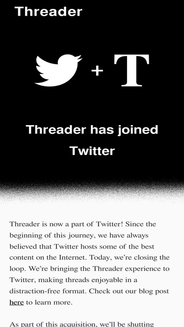 98%Welcome to Threader, a place to read and discover stories and knowledge from Twitter. Get a selection of good threads every day.