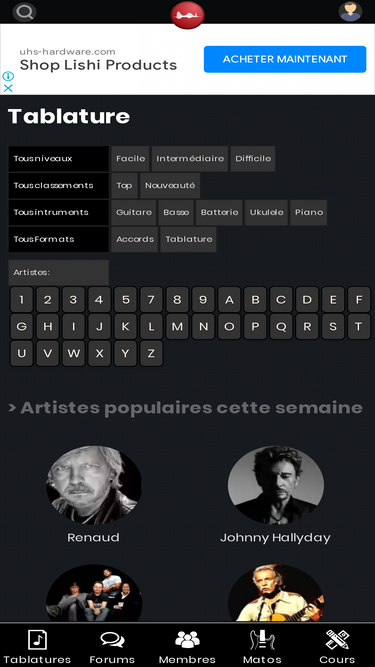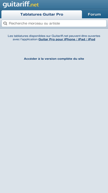 100%toutes les tabs (tablature, partition, tab) de guitare au format 'guitar pro'. le format 'guitar pro' permet d'obtenir une tablature exacte du morceau. 1001 tabs permet également de trouver les différents accords de guitare.par exemple, tablatures de jeux interdits, oasis wonderwall, tryo l'hymne de nos campagnes, simpsons the simpsons theme, bob marley no woman no cry, eagles hotel california, cranberries zombie, led zeppelin stairway to heaven ... tous les styles de musique pour la guitare